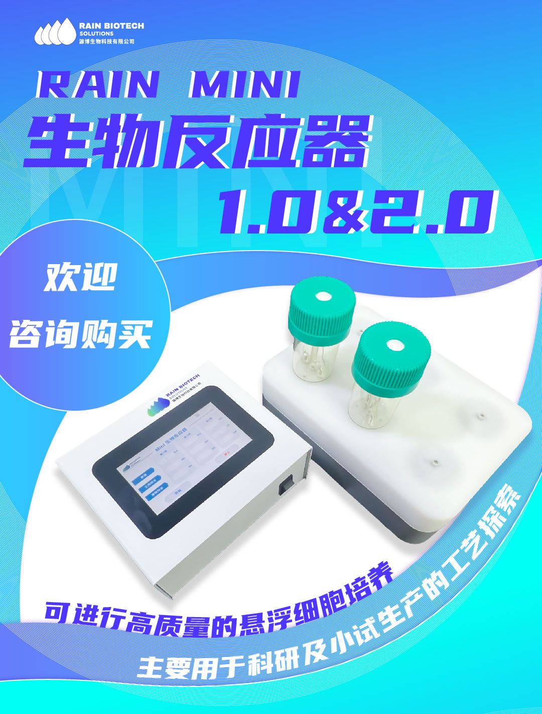 RAIN MINI2.0生物反应器可进行高质量的悬浮细胞培养,主要用于科研及小试生产的工艺探索。